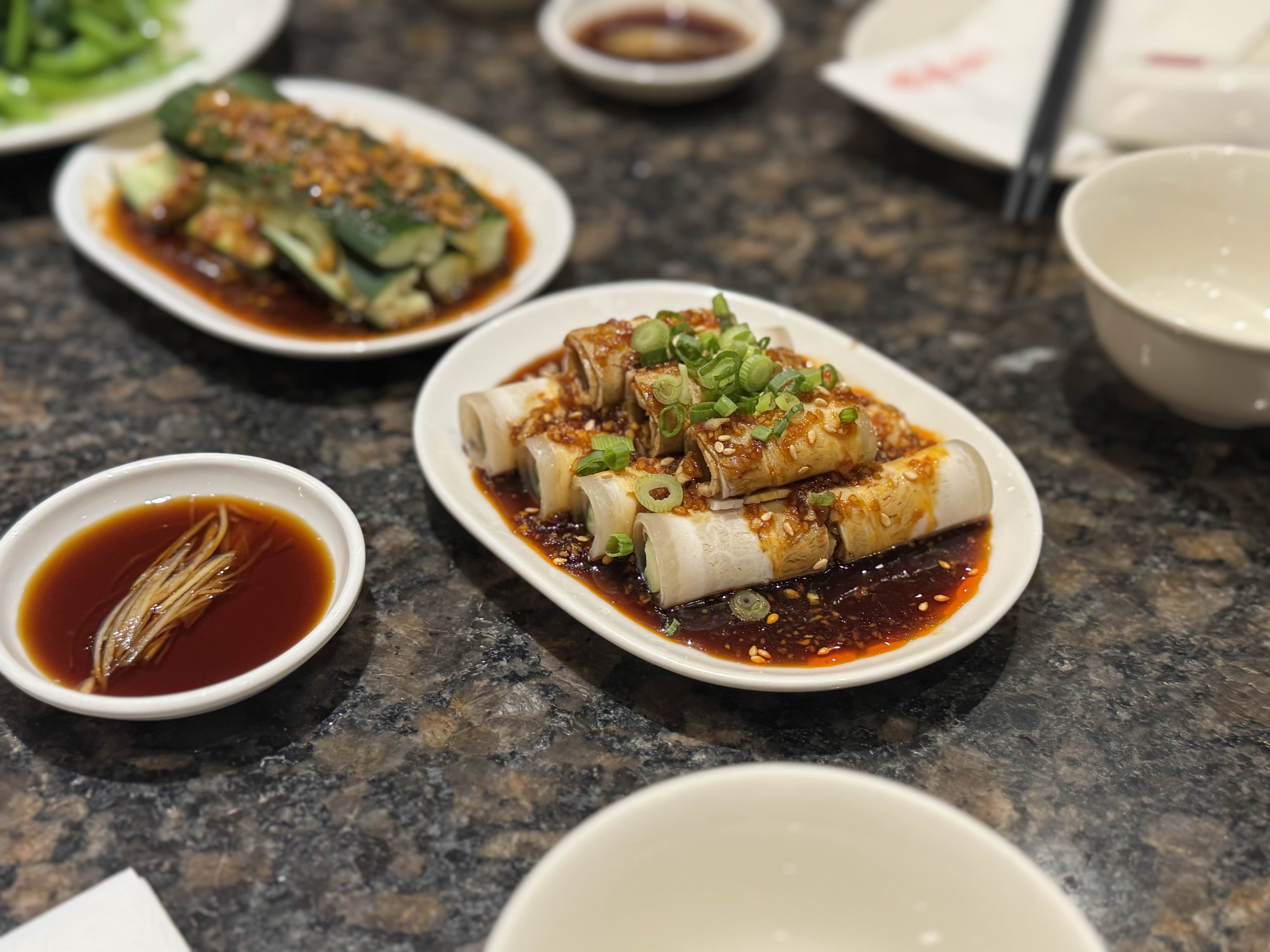 에피타이저를 세개를 시켰는데 모두다 탁월했어요! 오이무침은 정말 입맞춤을 부르는 맛이었어요. 매콤달콤한 양념에 절인 오이는 아삭한 식감이 살아있어 한 입 베어 물면 입안에서 상큼한 폭죽이 터지는 듯! 짭조름한 간장과 조화를 이뤄, 이어질 딤섬을 위한 입맛 돋우는 전령 역할을 톡톡히 했죠. 부드러운 시금치는 밥을 부르는 맛이었어요. 얇게 썬 돼지고기가 오이를 감싸고 마늘향이 가득한 소스에 담긴 요리는 처음 맛보는 맛인데 반해 버렸답니다. 모두다 건강과 맛을 동시에 챙길 수 있는 조합이었습니다.