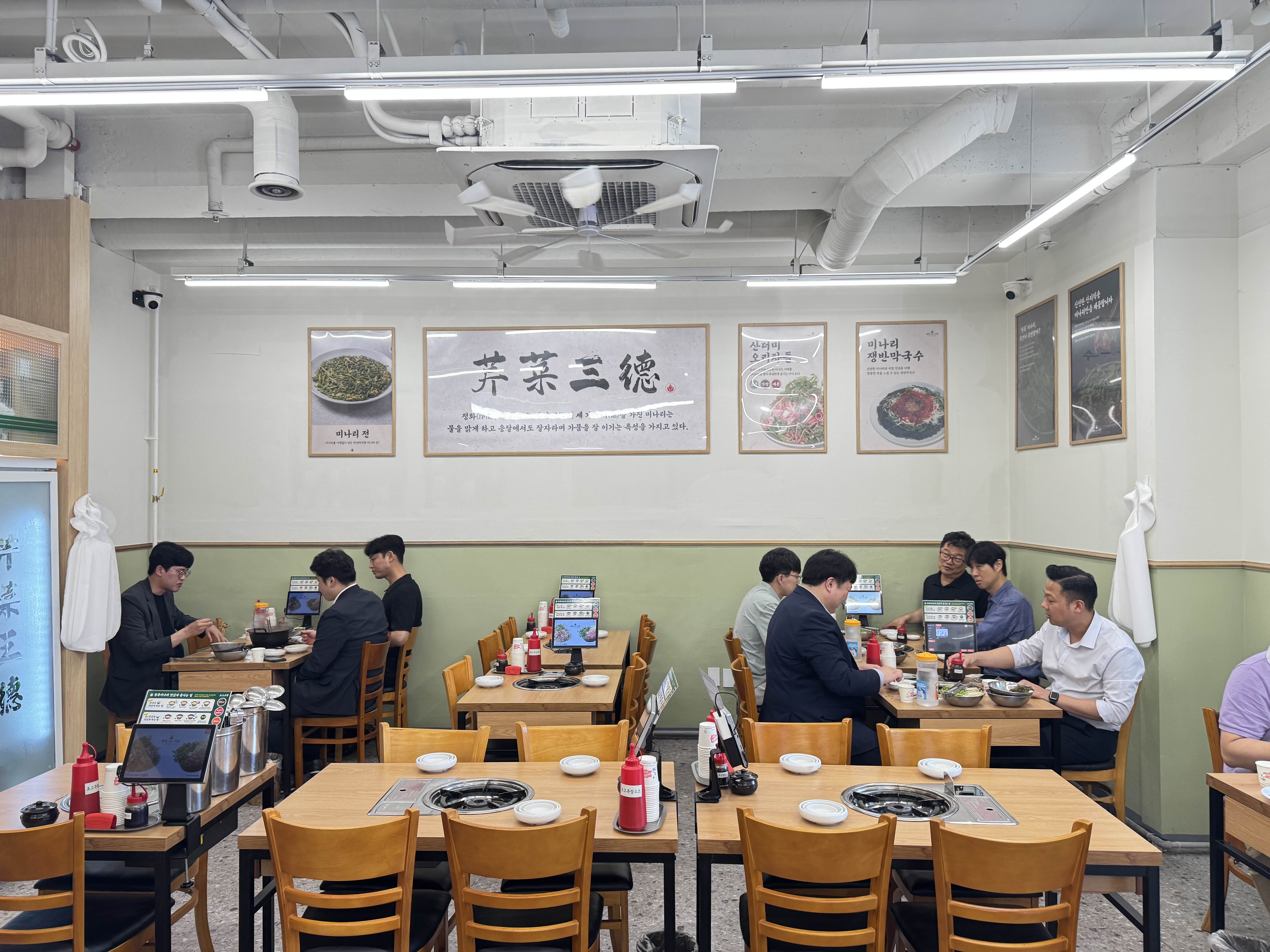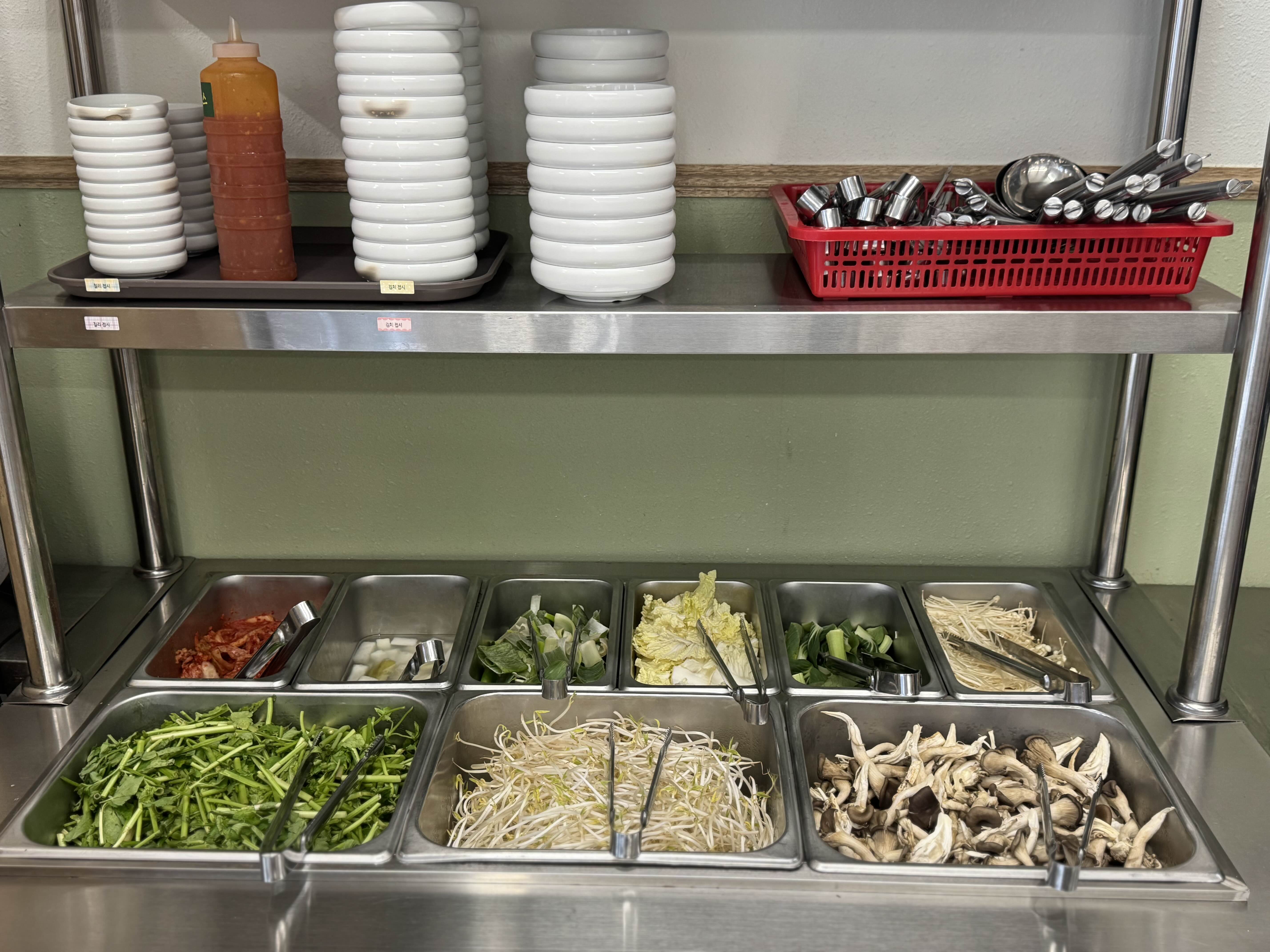 테이블에 올라온 미나리 샤브샤브는 큰 냄비에 두 가지 육수가 어우러진 진기한 풍경! 상큼한 미나리와 신선한 야채가 가득 담겨, 첫 숟가락부터 입안에서 봄바람이 휘몰아쳤어요. 셀프코너에서 마음껏 추가한 야채는 오랜만에 채소의 싱그러움을 실컷 즐길 수 있는 보물 상자였죠.